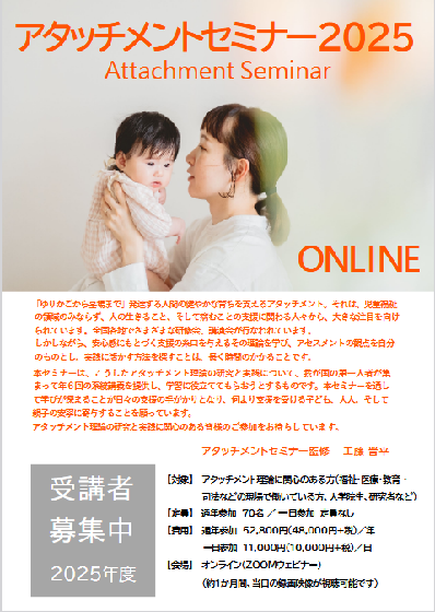 本セミナーはこのアタッチメント理論の研究と実践について、これから研究を始める大学院生や、今現在支援に関わっている方々に、我が国の第一人者を始めとする人々による系統的な講義と、実践に則した支援のヒントを提供し、その学習に役立ててもらおうとするものです。
